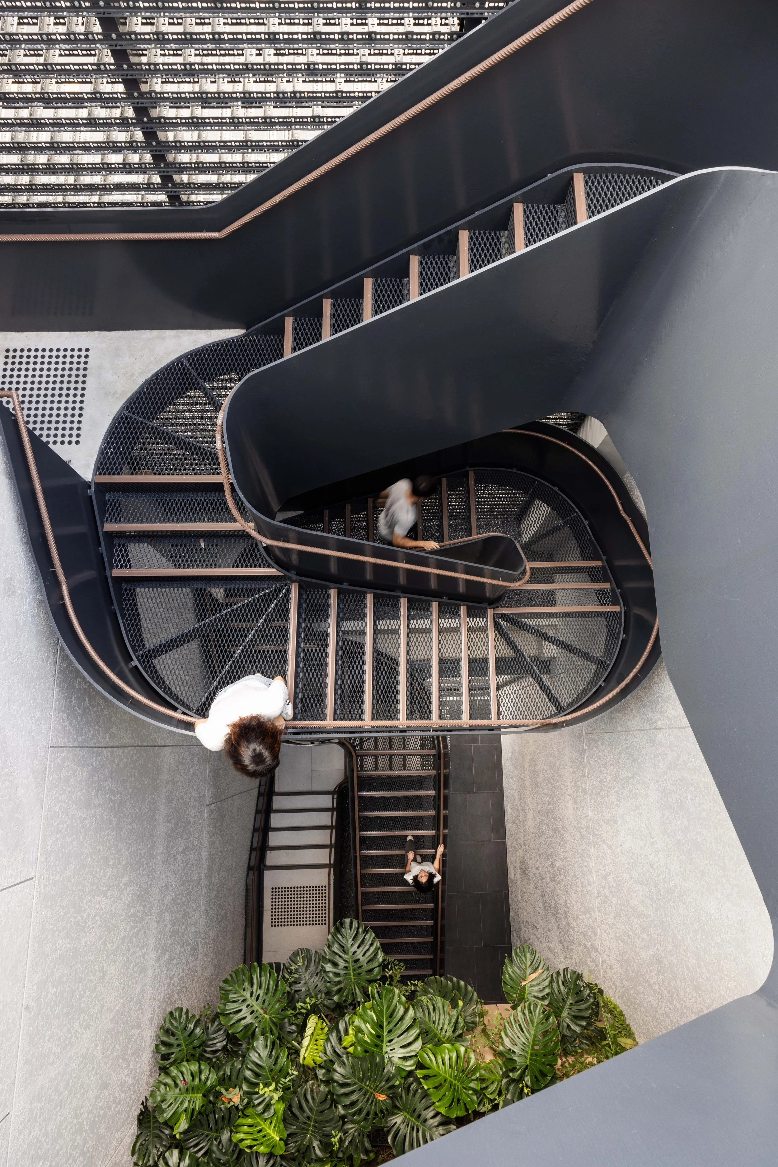 Unlike typical staircases with a uniform footprint, this design features varying configurations across different floors to encourage spontaneous interactions among users. This creates a 'social staircase'—a spatial element not only serving vertical circulation but also functioning as an informal communal zone where occupants can pause, engage, and connect. Integrated planters along the sides enhance this experience by softening the architecture and reinforcing a sense of connection between people and nature.