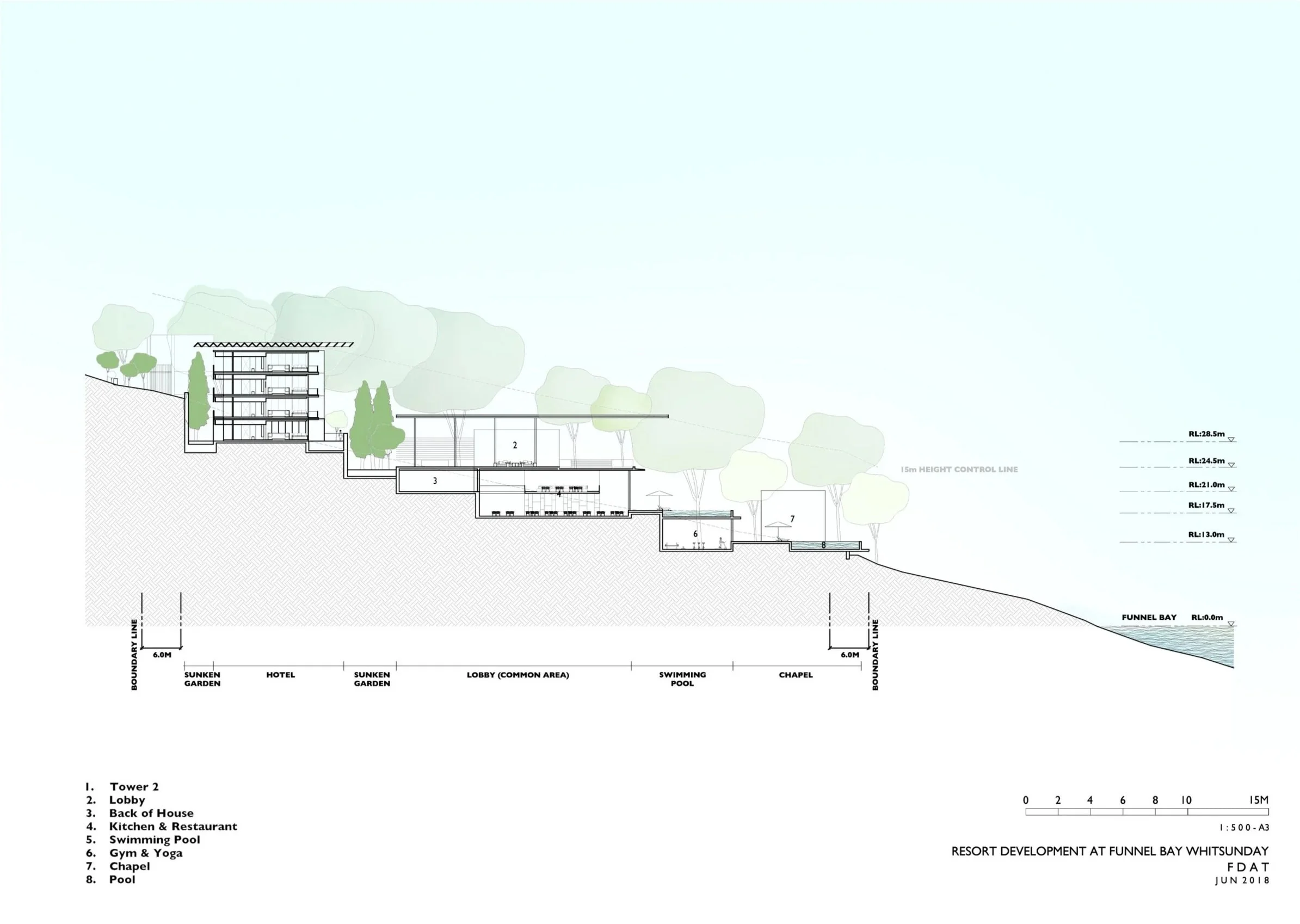 Funnel Bay Resort is envisioned as a retreat destination where architecture harmonizes with nature, offering guests privacy, seclusion, and an immersive connection to the Coral Sea and national park. Strategically sited at the western end of Funnel Bay, the development minimizes disturbance to adjacent residences while maximizing engagement with the surrounding landscape.