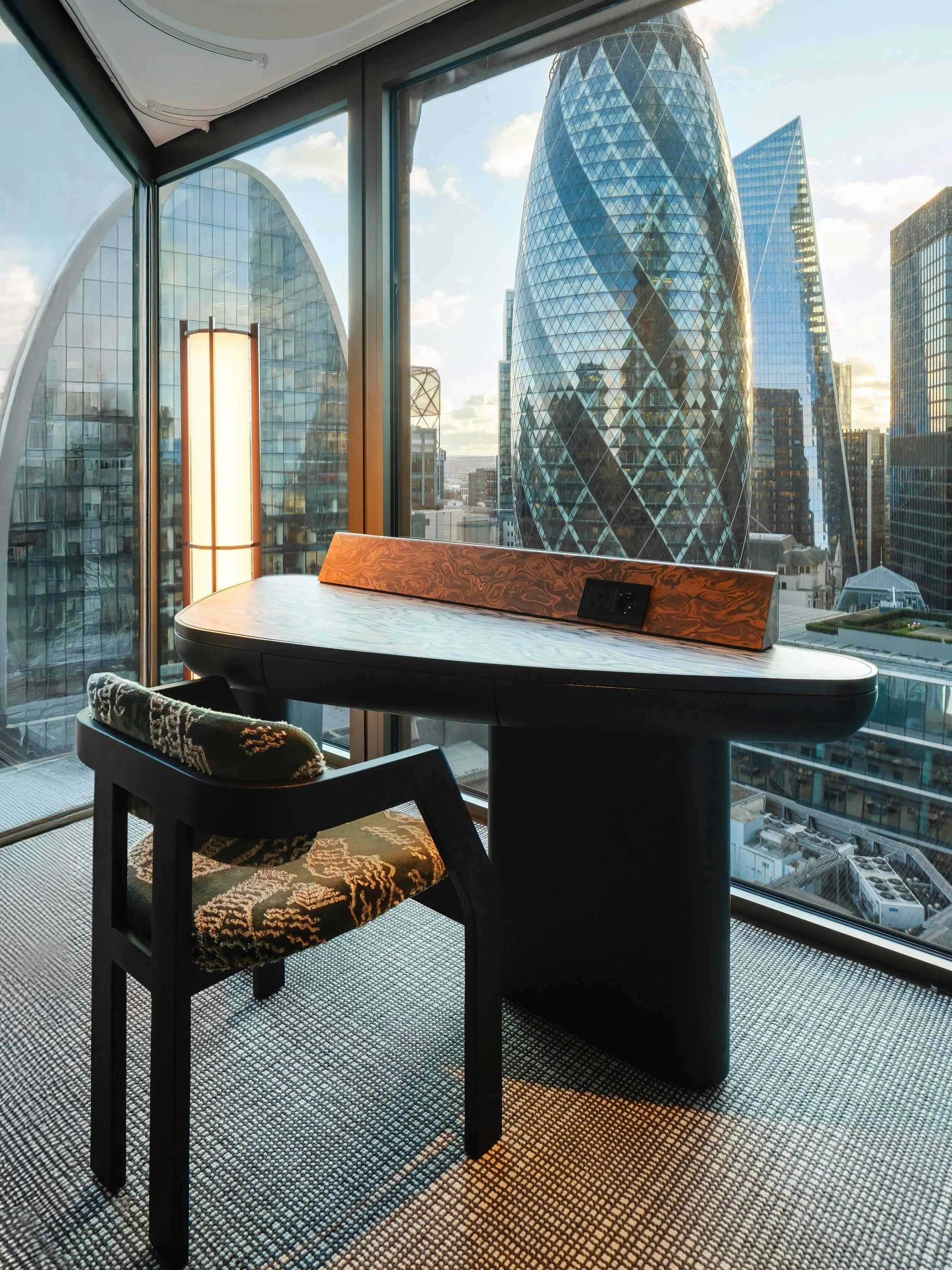 A hand-tufted luxury carpet elevates the atmosphere while subtly delineating zones within the suite. Functional indulgence is expressed through a walk-in wardrobe styled as a high-end boutique, complete with a dedicated makeup dresser. Spatial efficiency is enhanced by a teardrop-shaped writing desk that transforms residual space within the triangular plan into a purposeful feature.