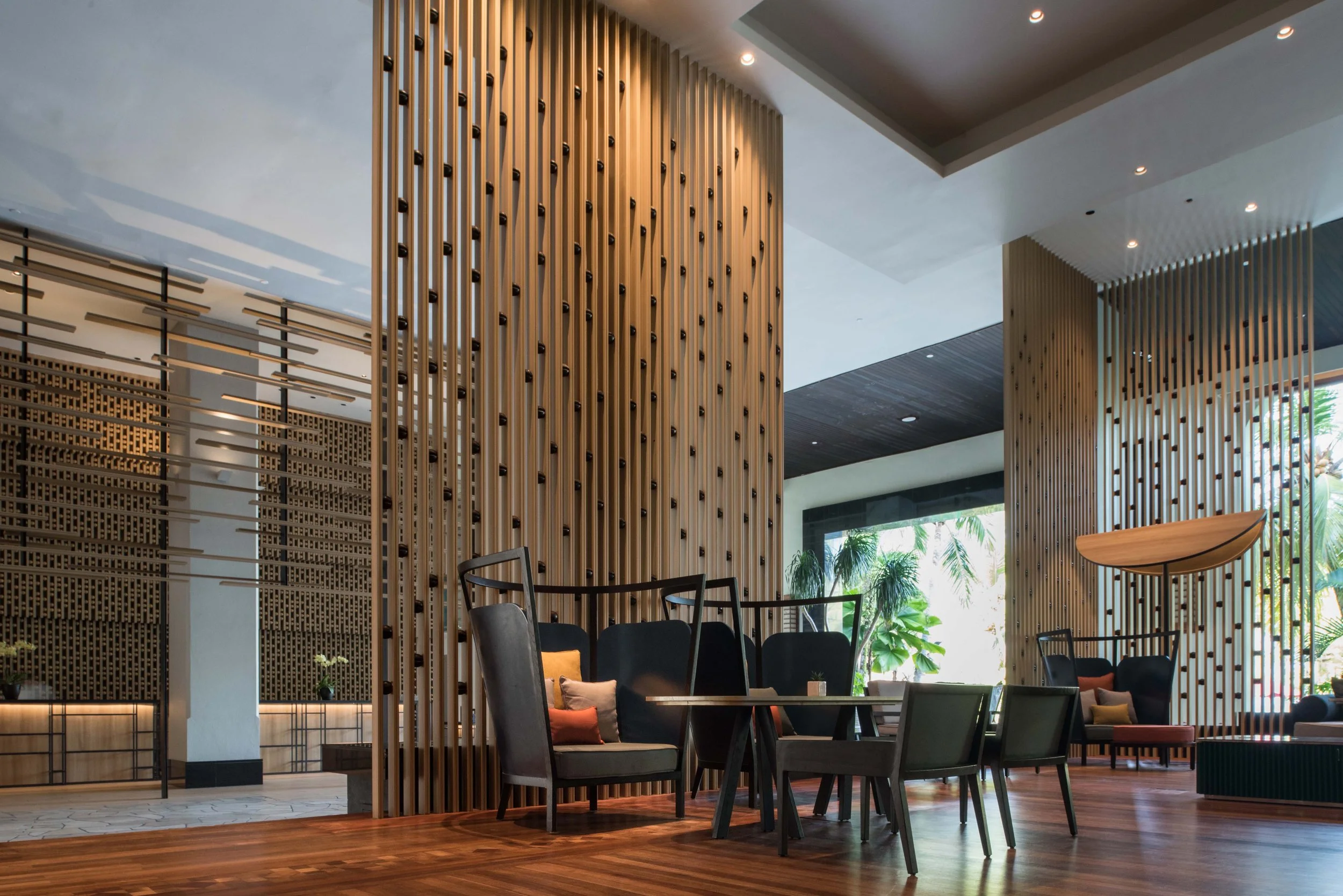 A central motif in the project is the Pinang screen, drawing inspiration from the Areca palm nut that gives Penang its name. These sculptural timber elements modulate light and air while adding depth and tactility to the interiors. Their repeating vertical forms evoke the rhythm of the tropics and reinforce a connection to place.