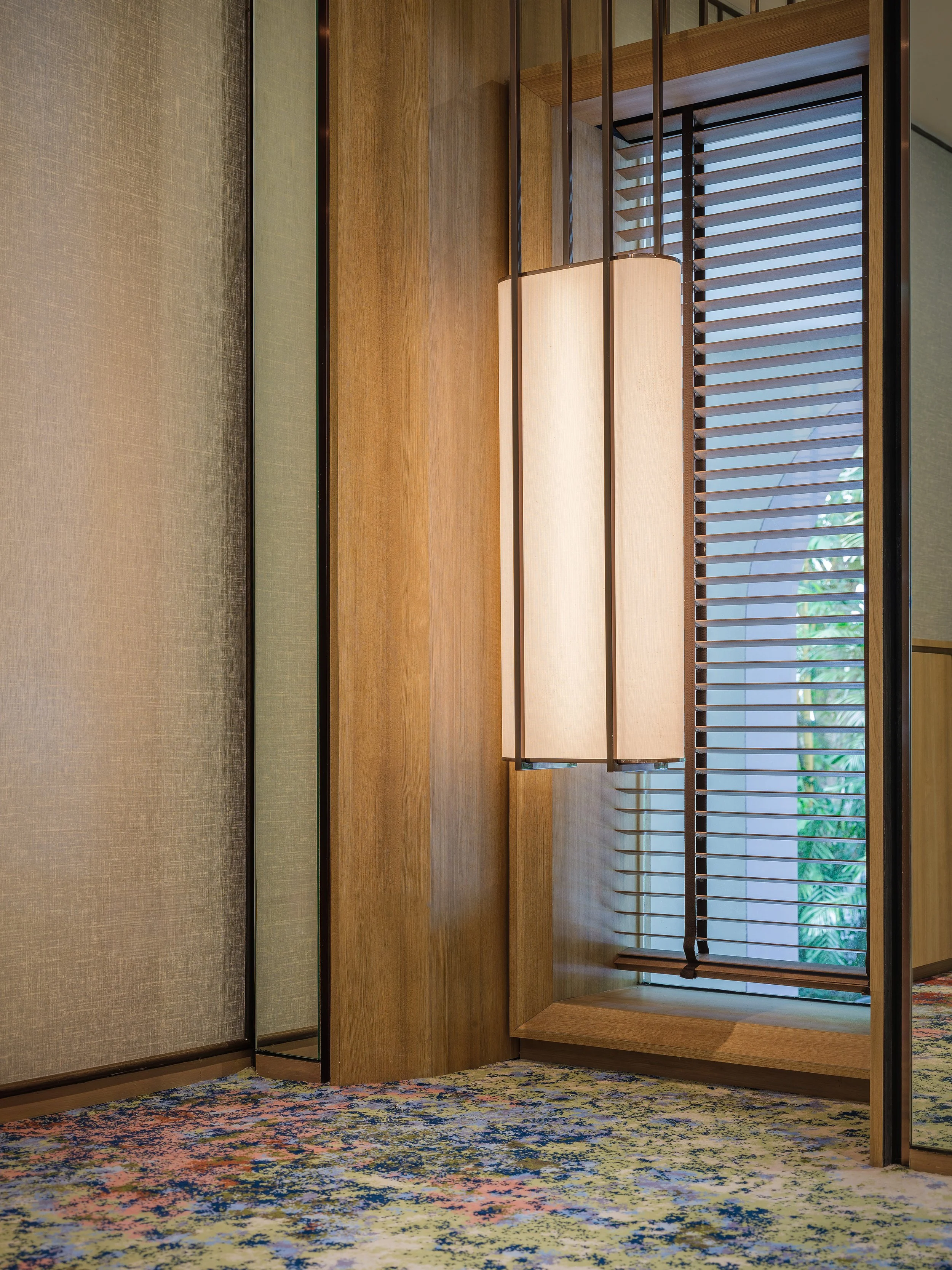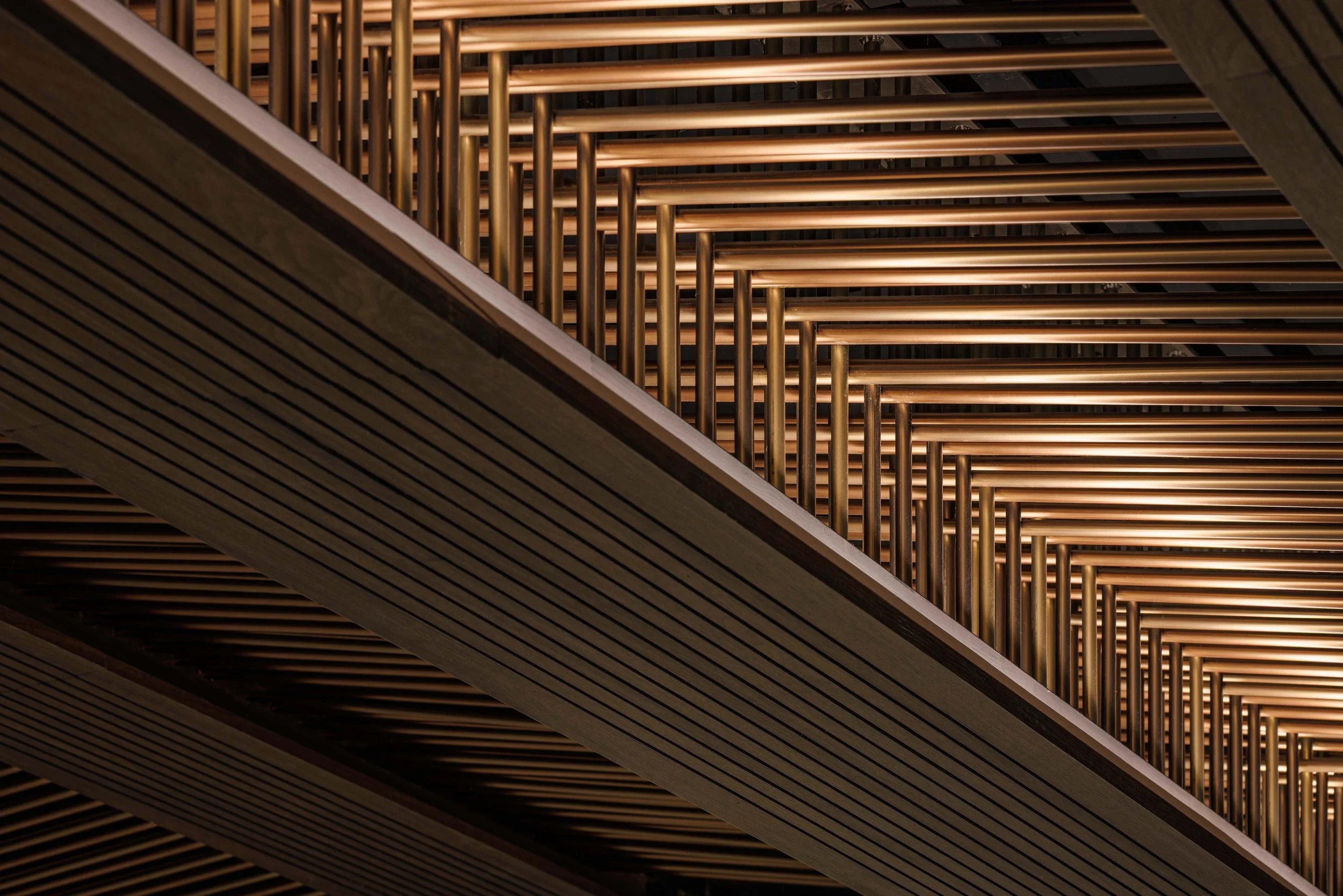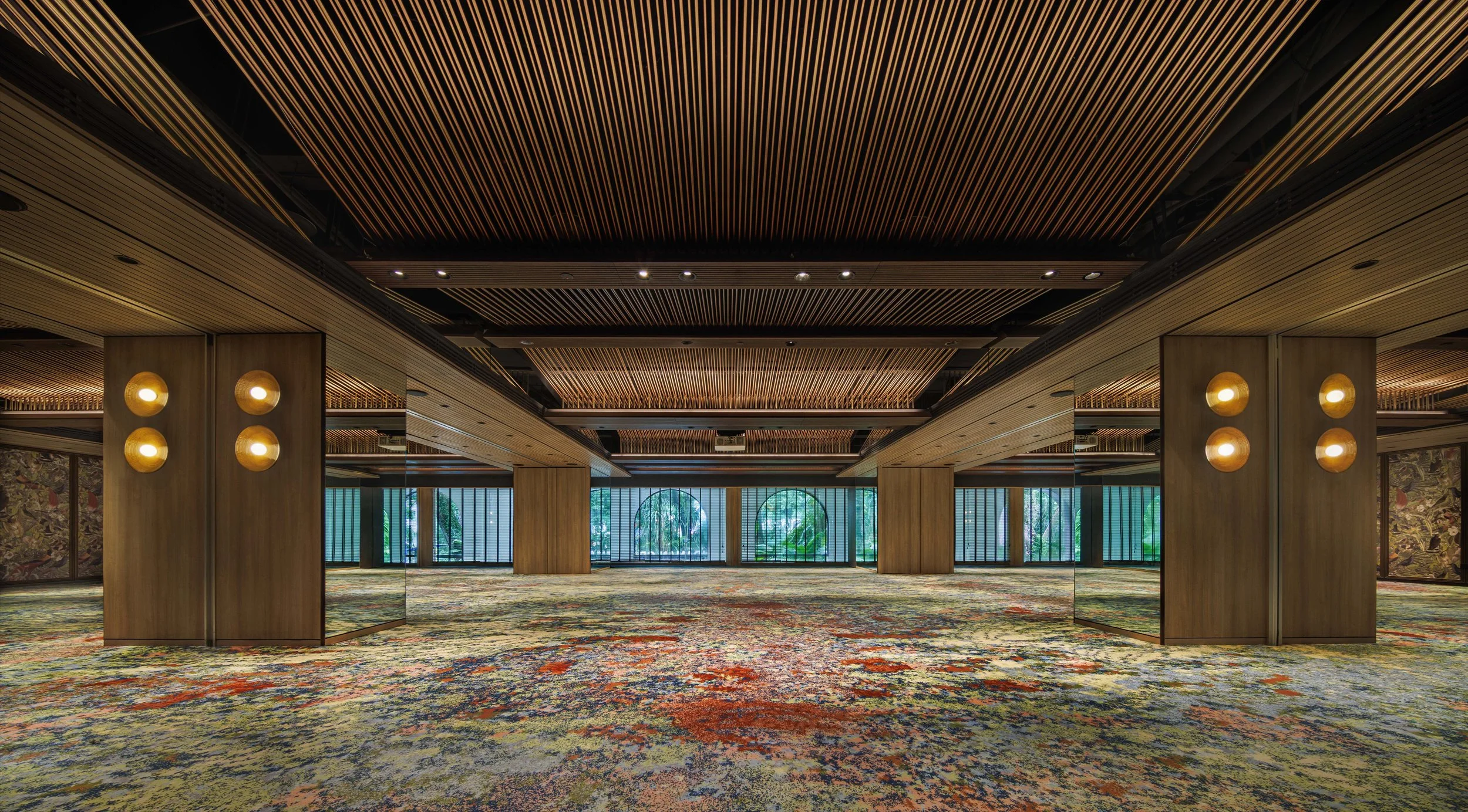 The Jintan Function Rooms at PARKROYAL Penang Resort are conceived as spaces that embrace the resort’s natural context while celebrating the cultural craft traditions of Penang. The design opens up once-enclosed areas to create architectural promenades that frame views of the surrounding greenery and majestic mature raintrees. These interventions establish a renewed dialogue between interior and landscape, while allowing natural wind flow and cross-ventilation from the nearby sea to enliven the pre-function space with a refreshing coastal breeze. At the heart of the interiors, the ceiling is inspired by the weaving machines historically used by Malay artisans, its intricate patterns are reinterpreted in a contemporary form. Crafted in copper-toned metals, the design provides both warmth and elegance, while the sloping, interlaced forms cleverly conceal building services such as air-conditioning ducts, achieving technical efficiency without compromising beauty.