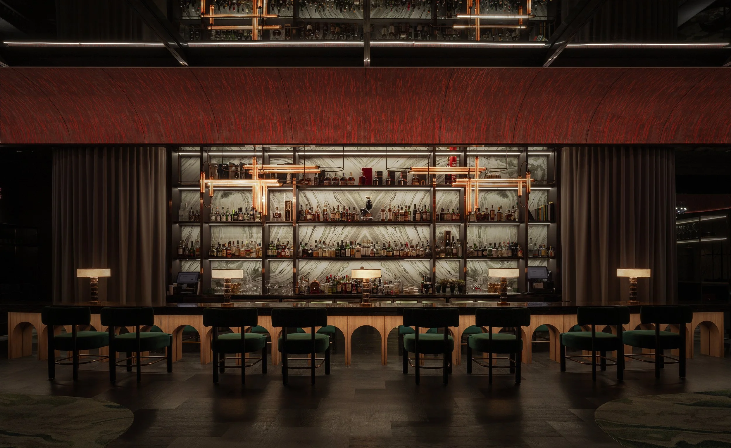 PLUME is the hotel bar at Pan Pacific Singapore. Located within an immense 37-storey atrium, the task was to create a unique identity that contrasts yet complements the rejuvenated hotel lobby. The original brief called for only an update to the weary bar finishes. However, we keenly felt that the bar was too open and exposed – visually, spatially as well as acoustically – the slightest clink and noise from the bar reverberating throughout the atrium. We sought to rethink the approach to designing a hotel lobby bar — a contradictory creature, born of perceived necessity, yet often struggling to maintain its identity and appeal as a destination.