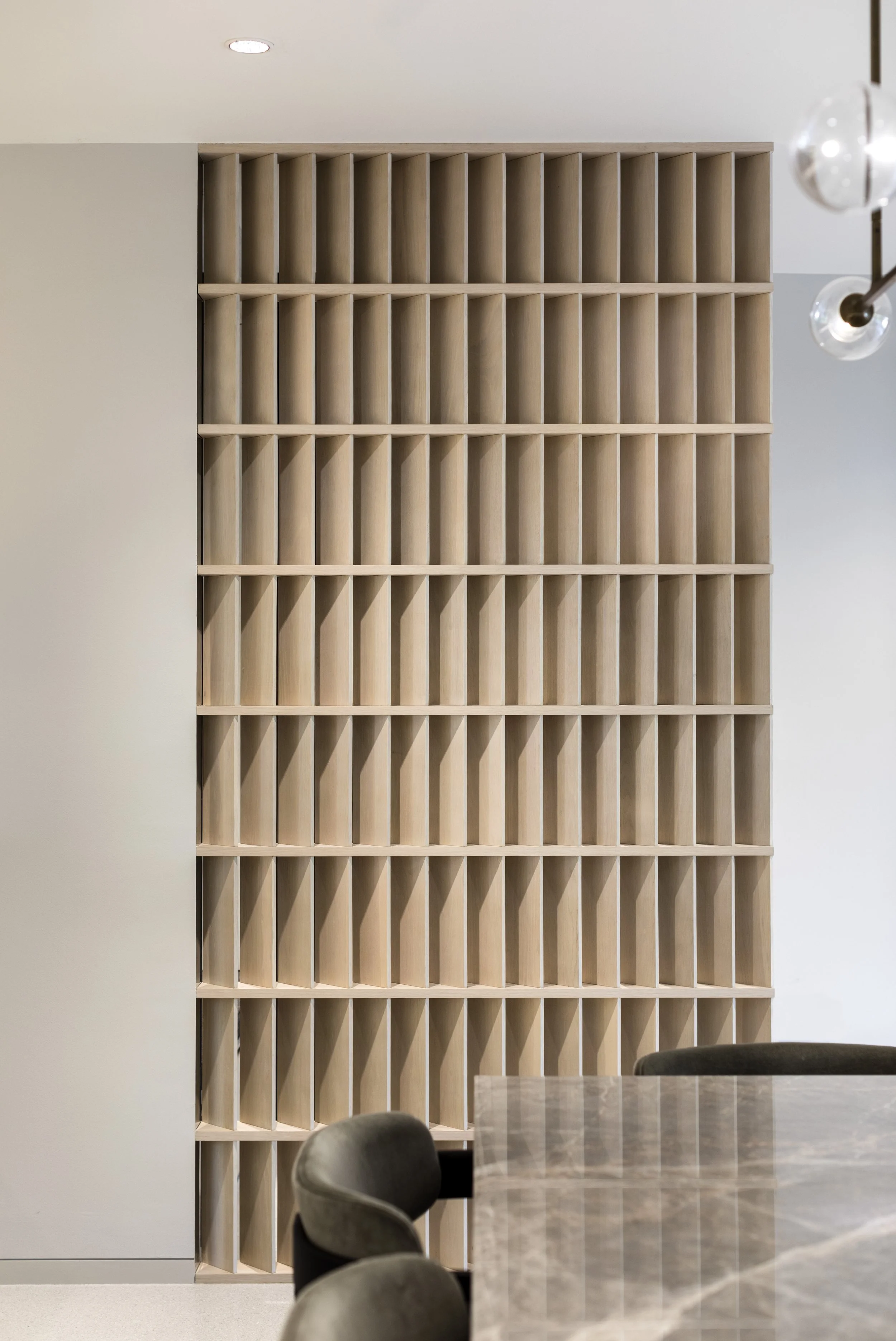 The design intervention sought to resolve these inefficiencies while enhancing spatial hierarchy. A handcrafted timber screen was introduced to define a subtle foyer at the entry, layering the arrival sequence and creating a sense of transition before entering the main living spaces. This restored privacy and imbued the home with warmth, rhythm, and visual interest.
