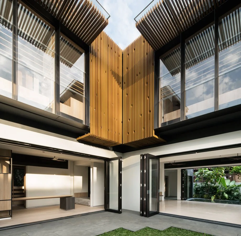 Tall bamboo planting serves as a green backdrop that creates greater privacy away the neighbour. Pocket gardens are planted with giant leaves alocasias and monsteras, combined with heliconias, umbrella and frangipani trees to create a textured tropical garden. These spaces are inserted between residential wings and along view axes such living spaces are always flanked by greenery. Bi-fold doors allow interior spaces to fully open up to the various gardens and allow for amply cross-ventilation.