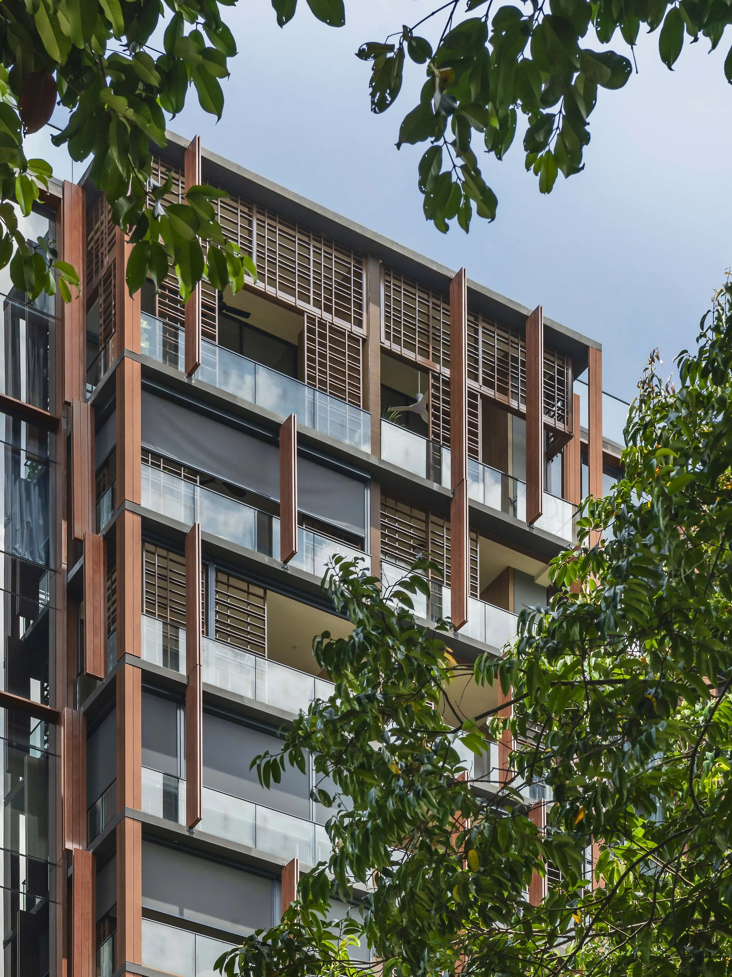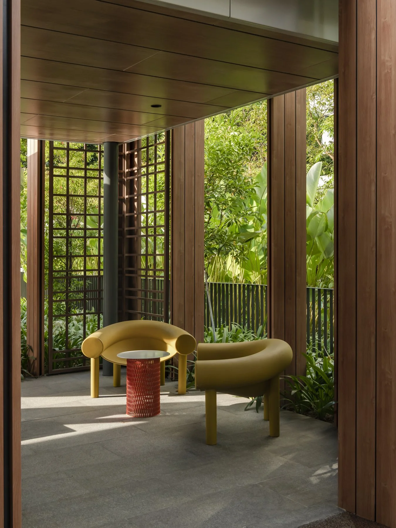 Natural materials are carefully selected to build a seamless connection between built form and nature. Timber-look aluminium screens offer the warmth and texture of timber without the maintenance issues, adding both visual richness and functional durability to the overall design.