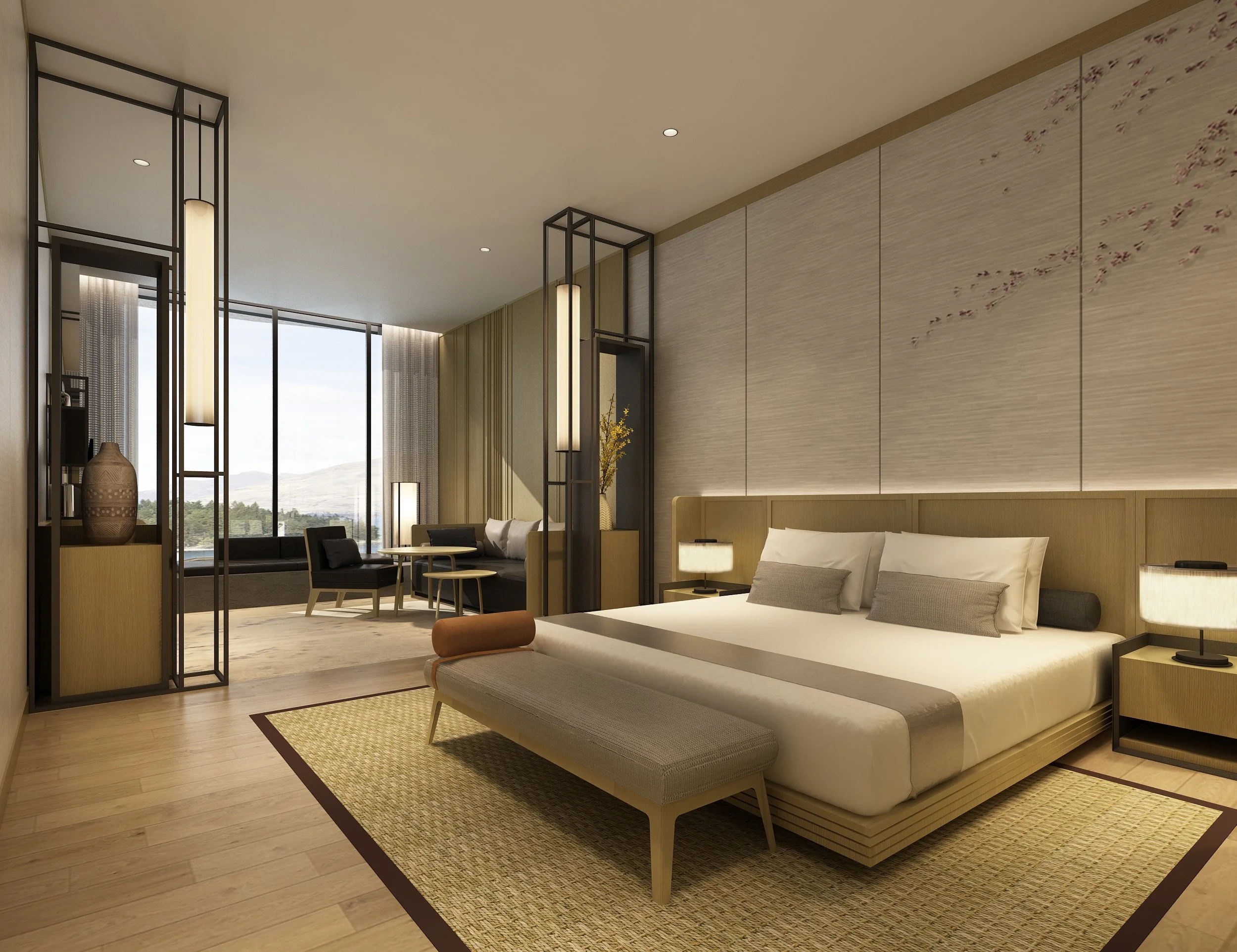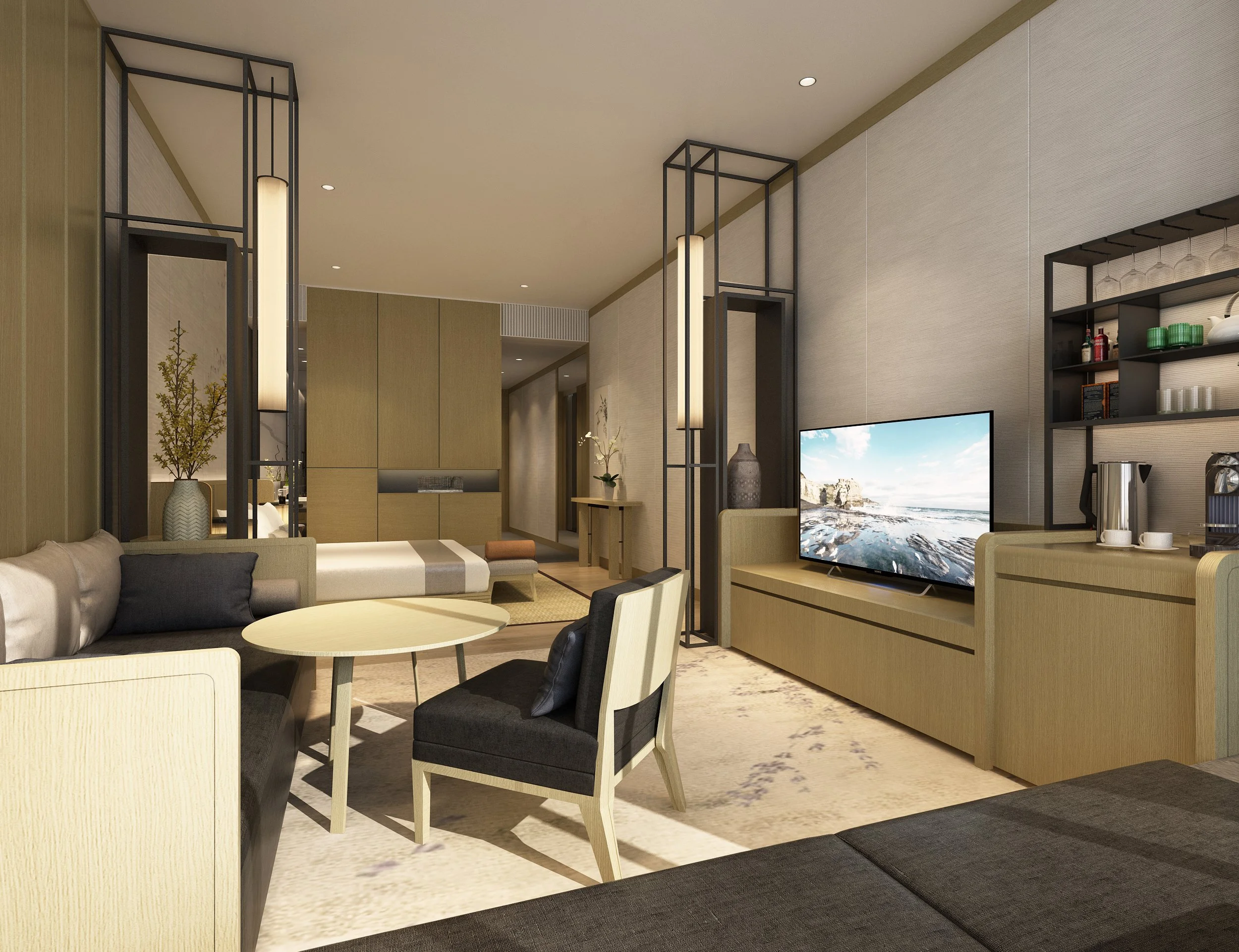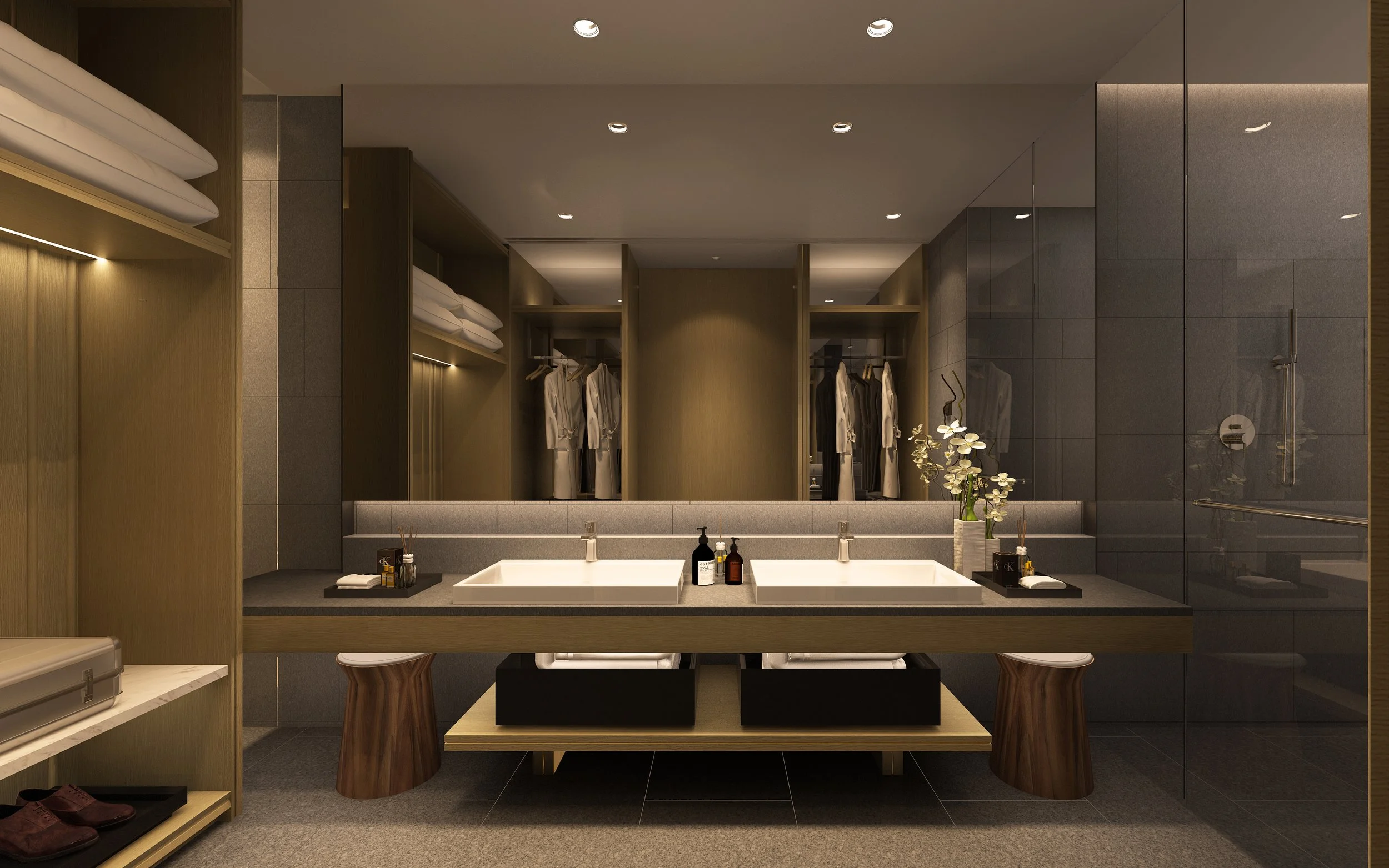 At street level, Thompson Street is activated with upscale dining, lounges, concierge services, and curated retail, positioning the hotel as a lively destination for locals and visitors alike. A garden level above the commercial podium offers guest rooms with balconies overlooking landscaped greenery, further blurring architecture and nature. The facade, expressed as vertical screens, balances guest privacy with visual lightness, ensuring the hotel integrates seamlessly into its context.