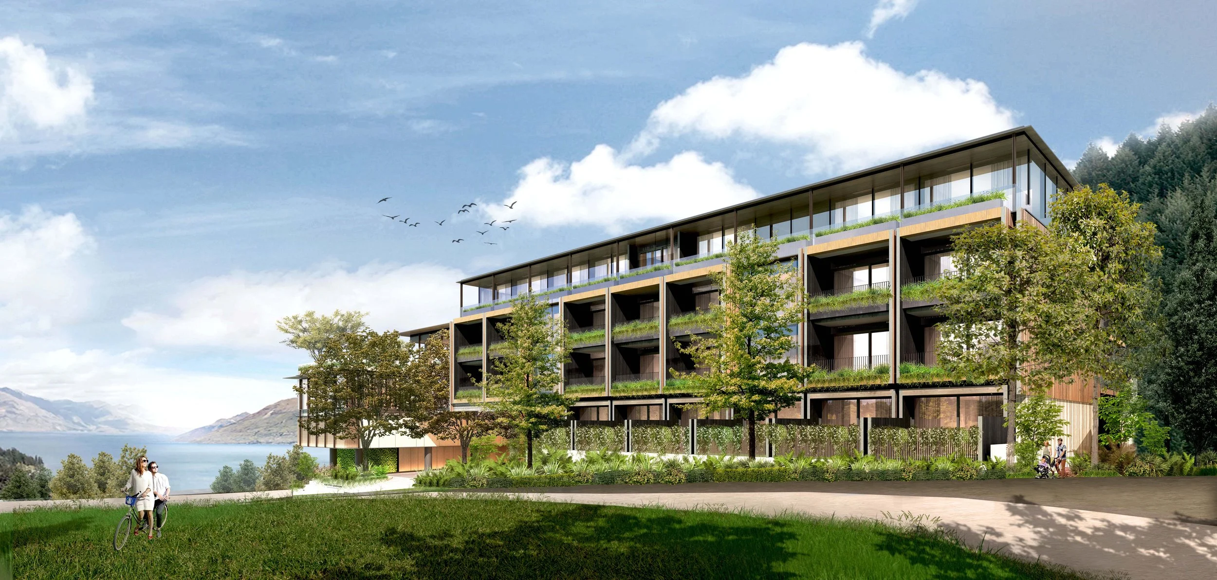 The design transforms a vacant parking site into a contemporary hospitality landmark that harmonises with its residential surroundings while contributing to the town’s growth. Located a short walk from the town centre, the development embraces Queenstown’s new zoning strategy, which supports higher density and future urban vibrancy.