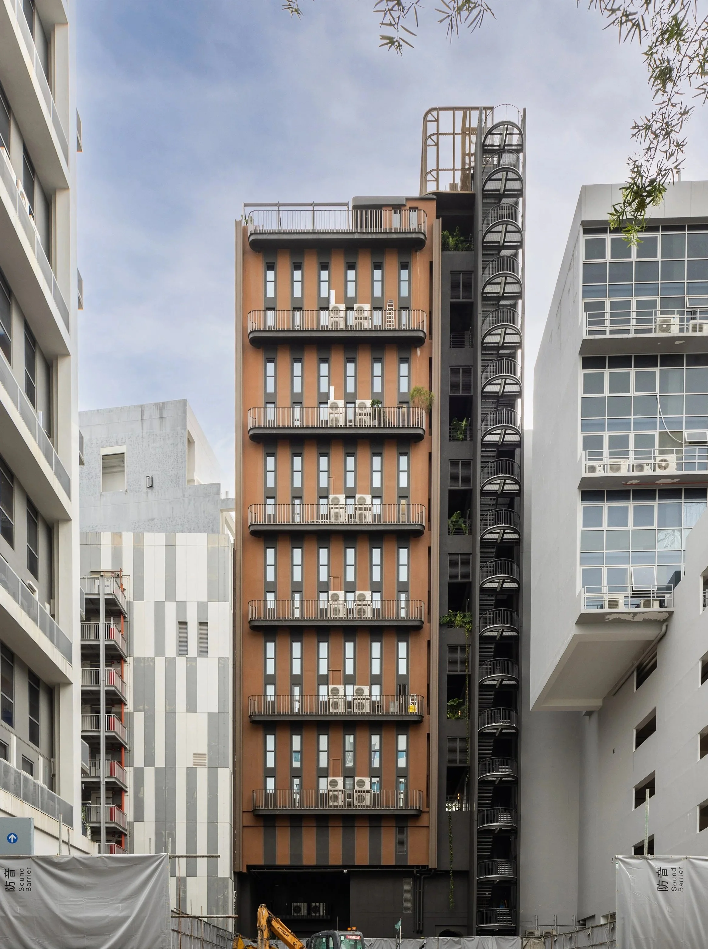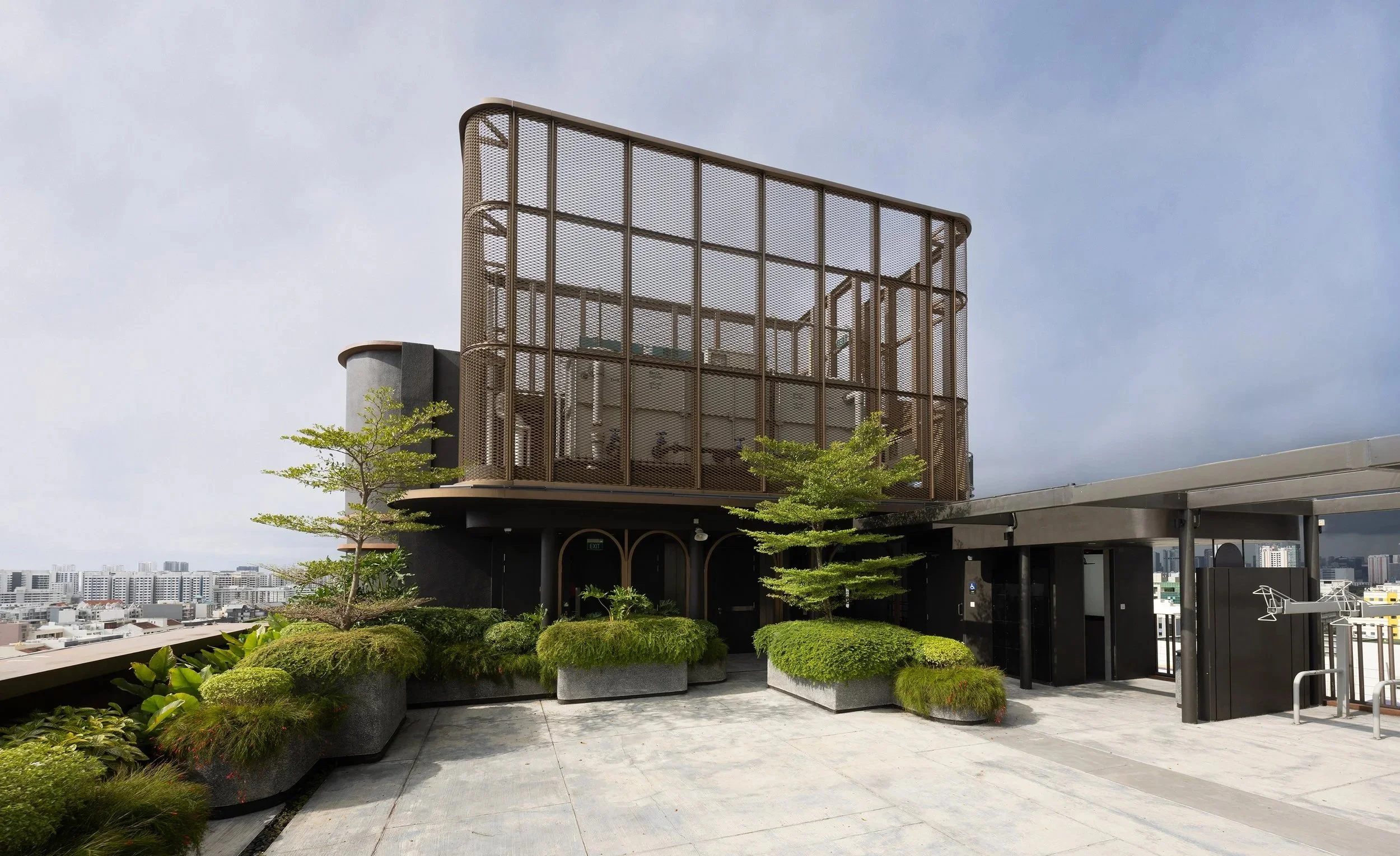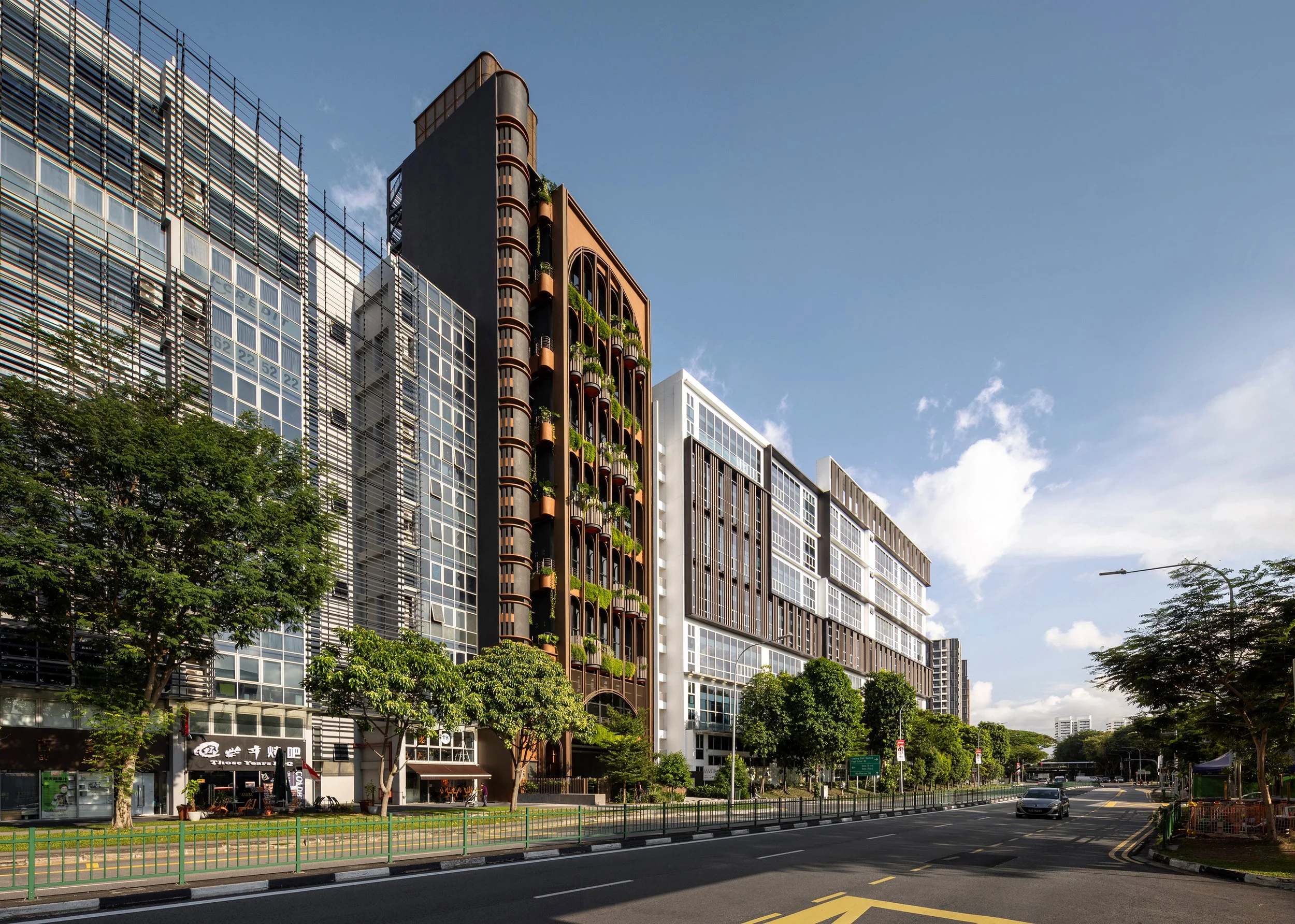 The façade composition—defined by its arch elements, layered depth, and dark material palette—evokes a modern gothic aesthetic, where sculptural intensity meets restraint. Red corten and expanded mesh elements introduce a tactile industrial reference, grounding the building in its context while enriching its visual rhythm. Merging ambition with functionality, the project establishes a new language for light industrial developments in the city.