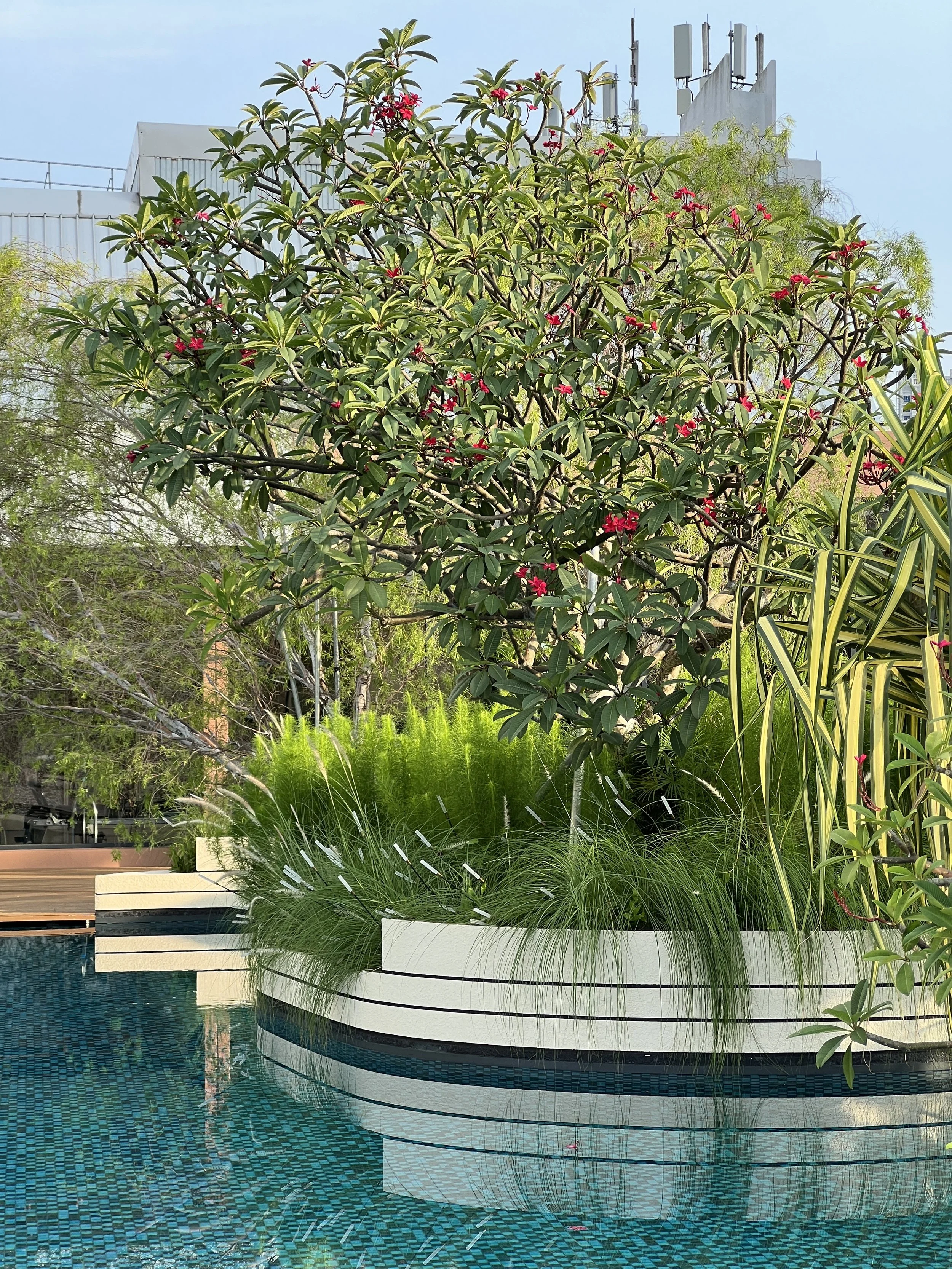 A diverse selection of plant species native to Singapore forms the backbone of the design, supporting biodiversity while celebrating local ecology. Trees and shrubs with drooping, graceful forms—such as weeping willows and pennisetum—enhance the serene ambiance, while pollinator-attracting species like passiflora and melastoma invite butterflies, bees, and birds into the landscape. The vibrancy of the space is further amplified with bold accent plants such as Livistona eudauensis, adding explosive drama and texture through the foliage. Aquatic-friendly species like artemisia and the monarch fern (Microsorum) blur the boundaries between planting and water, reinforcing the immersive, garden-like character of the pool environment.
